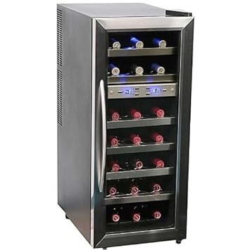 This Whynter Dual Temperature Zone Wine Cooler offers premium quality and sophisticated design. It allows for 21 bottles of wine storage capacity, 6 bottles in the top zone and 15 bottles in the bottom zone with vibration-free thermoelectric cooling. With the thermoelectric system, your wine is kept at the appropriate temperature and humidity level without damaging vibrations. This cooling system has no moving parts and is CFC-free, which means that you get silent, long-lasting, and environmentally safe refrigeration for your collection. Features: Adjustable thermostat for each zone - Upper zone (44F - 66F), Lower zone (50F - 66F) Enhanced LCD temperature displays for both zones Solid state components for long life - the only moving parts are fans to circulate air for even temperature distribution Soft interior LED lighting with on/off switch Six removable premium stainless steel trimmed scalloped chrome shelves.